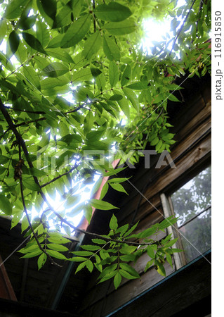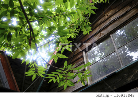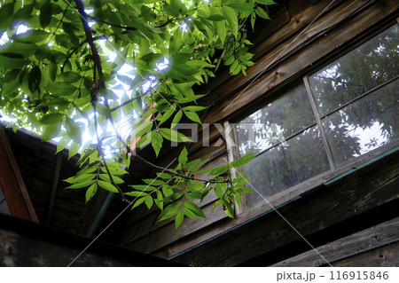 納屋と深い森 森 環境 自然 樹木 木 深山 植物 緑 エコ eco 雑木