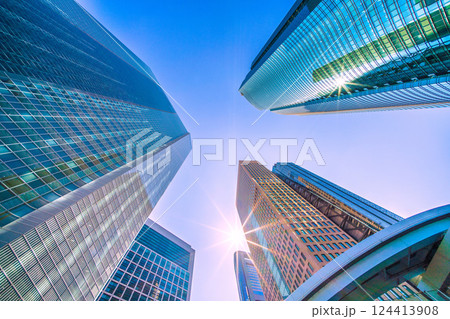 高層ビルを見上げるオフィス街の風景