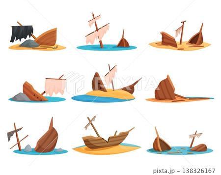 Shipwreck scenes. Cartoon broken ships, boats on sand beach, in water. Vessel broken on stones or rocks. Sinking wooden ship, orl brigantine, sapid vector landscape elements
