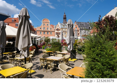 View of Tirgonu Street and medieval buildings through an outdoor cafe, Riga old town, Latvia.