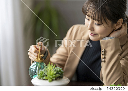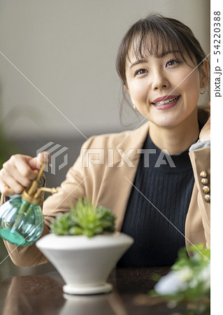 多肉植物ハオルチアオブツーサの美しい透明感の窓を楽しむ為霧吹きで水を与える自然を大切にする優しい女性