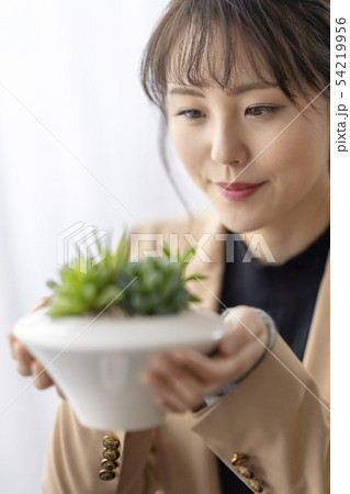 ハオルチアの中でもオブツーサの葉は特に透明感があり大人気の多肉植物を大事に育てる笑顔が可愛い女性