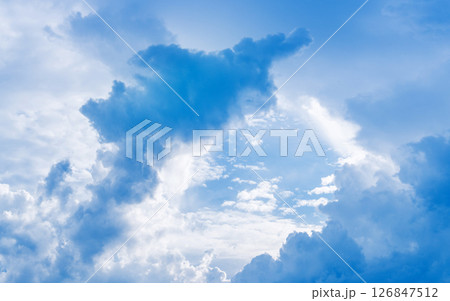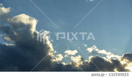 Dramatic blue sky with fluffy cumulus clouds and sunlight breaking through