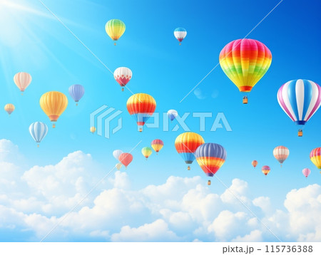 Vibrant hot air balloon floating in a clear blue sky with fluffy white clouds.