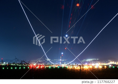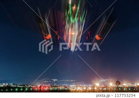 夜の伊丹空港に着陸する飛行機 スローシャッター