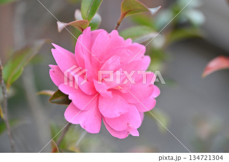 鮮やかに咲くピンク色のサザンカ(山茶花)の花と緑の葉