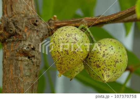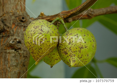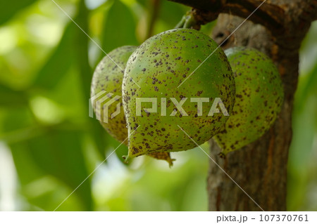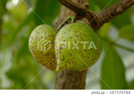 Closeup of ripe santol or sentul or cotton fruit hanging in the santol tree.