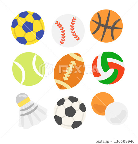 いろんな球技のボールなどの手描きイラスト(カラー/主線なし)
