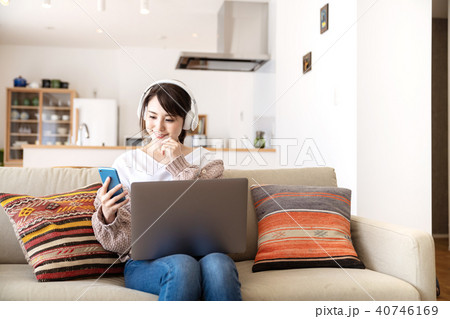 スマホで音楽を聴く女性