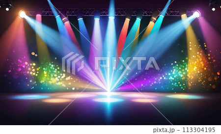 Empty stage concert with colorful lighting laser beam spotlight show in disco pub club bar background for party music dancing festival performance. Entertainment nightlife. Celebration event.