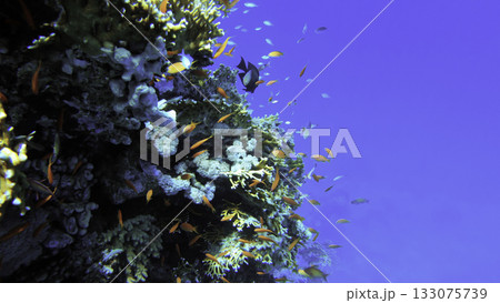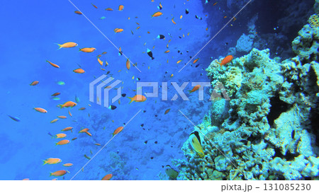Underwater life of reef with corals, shoal of Lyretail anthias (Pseudanthias squamipinnis) and other kinds of tropical fish. Coral Reef at the Red Sea, Egypt.