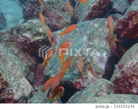 海の岩場を泳ぐ赤い魚のキンギョハナダイの群れ