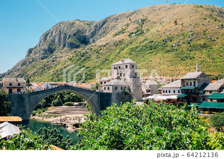 The Stari Most bridge, old bridge on Neretva river in Mostar town, Bosnia and Herzegovina, Europe. Iconic bridge spanning tranquil river with historic buildings, lush greenery, and mountain backdrop.