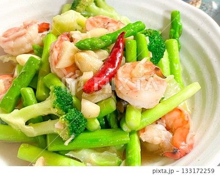 中国家庭料理・蝦仁小炒(海老とアスパラ、カリフローレの中華炒め)