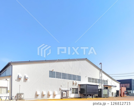 白い外壁の工場と青空