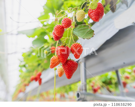 ビニールハウスで栽培されているいちご・いちご狩り園の温室
