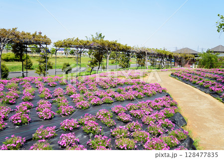 「東京都」春の荒川赤羽桜堤緑地の芝桜と桜