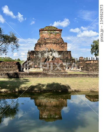水辺に反射するスコータイ歴史公園内のワット・マハタート遺跡と石像