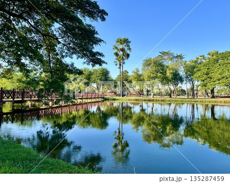スコータイ歴史公園のワット トラパングーンと水面に映る赤い橋