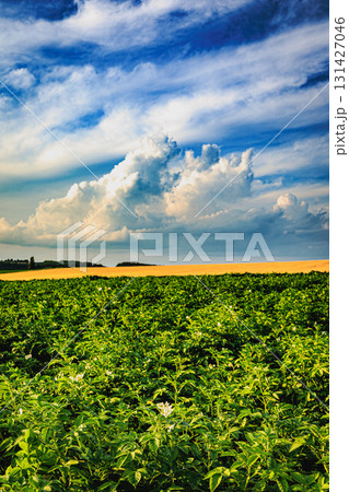 美瑛・就実の丘を彩るジャガイモ畑の花と夏空