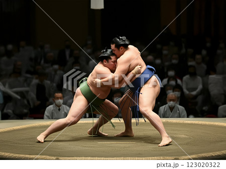 大きな体躯の力士が真正面からぶつかり合って、力強い投げ技が決まる瞬間。ちょんまげ,髷,大きな,筋肉,