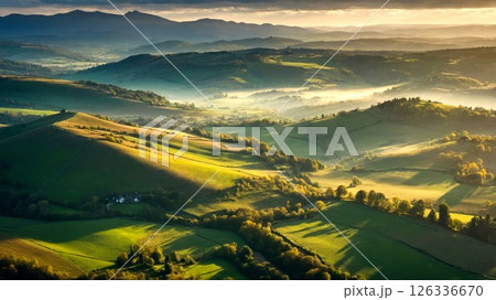 Rolling green hills stretch across a sunlit valley with soft shadows, surrounded by distant mountains under a glowing sky. A peaceful landscape showcasing nature's beauty and tranquility