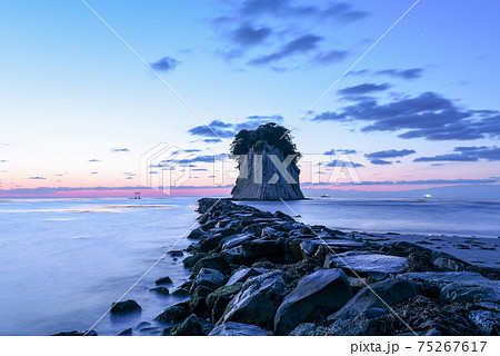 真鶴岬の三ツ石と朝焼けの美しい海岸風景