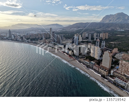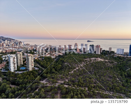 coastline mountain vista, panoramic aerial image showcasing natural landscape and city silhouette at dawn