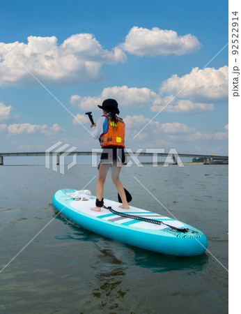 夏の海でサップを遊んでいる小学生の女の子の様子