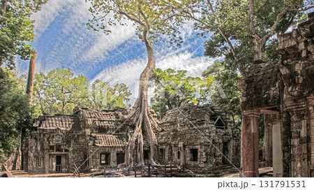 The roots of the trees sprouted into the ruins of temple Ta Prom Angkor Wat in Siem Reap, Cambodia.
