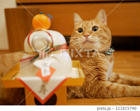 鏡餅を見つめる茶トラ猫