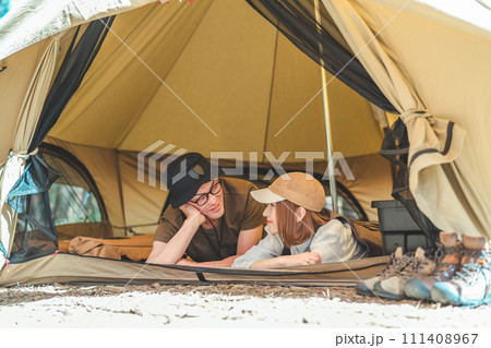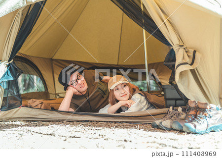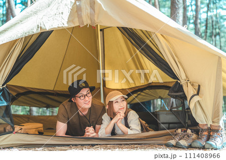 夫婦でキャンプをするアジア人の男女