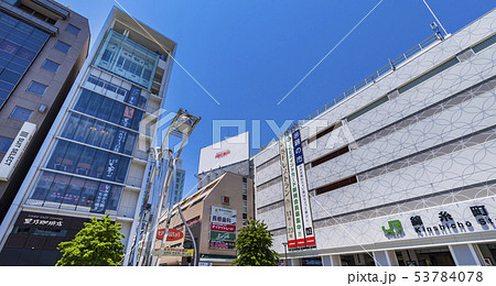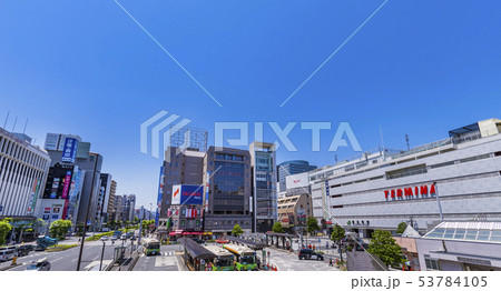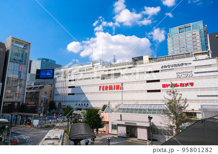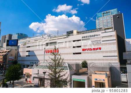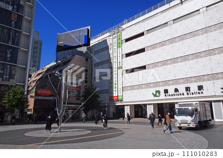 日本の東京都市景観 錦糸町駅前のビルガラスに映る東京スカイツリーや錦糸町駅直結の駅ビル「テルミナ」