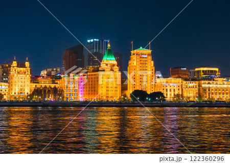 中国 上海市、ライトアップされた外灘の建築