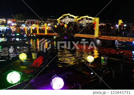 ベトナムの世界遺産(ホイアン)の夜景とランタンが灯す船の光の軌跡