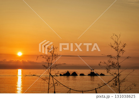 夕暮れ時の美しい二見ヶ浦の白い鳥居と夫婦岩(福岡県糸島市)