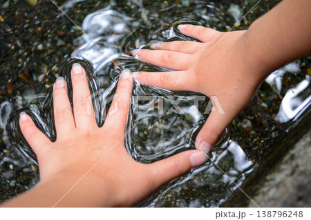 Hands touching the clean stream from the mountain, sustainable water and environment