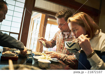 寿司、天ぷらを楽しむ外国人観光客と和服の店員