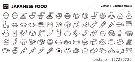 日本の料理と食べ物のアイコンセット(細線・ベクター素材) 和食、寿司、和菓子、お菓子のベクター素材