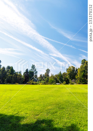 A vast green grass meadow stretching towards the horizon with a trees