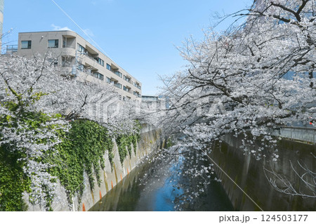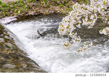 春の桜並木 満開の観音寺川の桜 花筏 福島県猪苗代町
