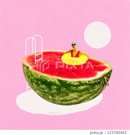 Young woman in swimsuit and cap floats inside sliced watermelon as pool against pink background. Contemporary art collage.