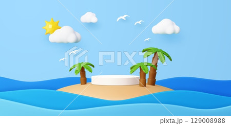 Tropical island podium stage with palm trees and white round display surrounded by blue ocean waves. 3d vector cartoon scene features sky clouds, seagulls and bright sun, evoking a sunny paradise vibe