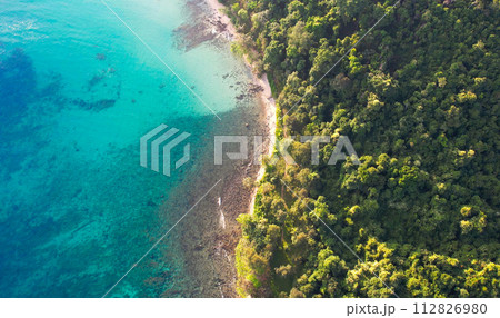Aerial view of the dark green forest and the sea. Natural ecosystems of forests and oceans. concept of natural forest conservation