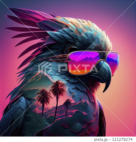 Macaw portrait. Brightly colored Macaw with glasses for summer vibes. Parrot summer tropicalpunk