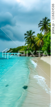 tropical beach view at cloudy stormy day with white sand, turquoise water and palm trees, neural network generated image