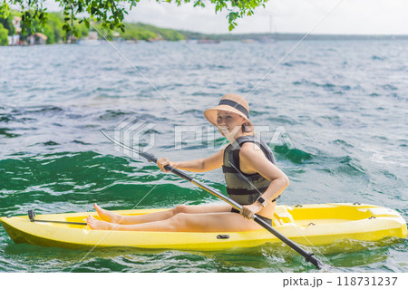 Woman kayaking on Bacalar Lake in Mexico. Adventure tourism in Quintana Roo, outdoor exploration, and water activities concept