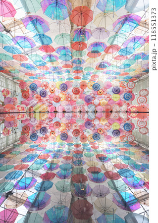 滋賀県草津市の商業施設に釣り下げられた色とりどりの傘を撮影