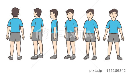 前後横からみた8頭身男性の全身のカラーイラストセット