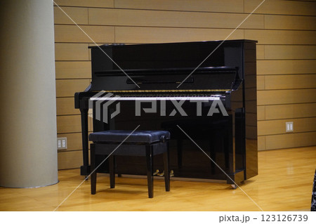 発表ステージに設置されているアップライトピアノ